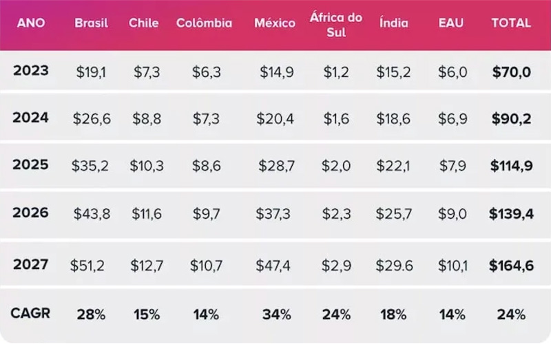 Crescimento acelerado: o e-commerce cross-border global deve saltar de US$ 1,47 tri em 2025 para US$ 4,81 tri em 2032, com CAGR de 18,4%.