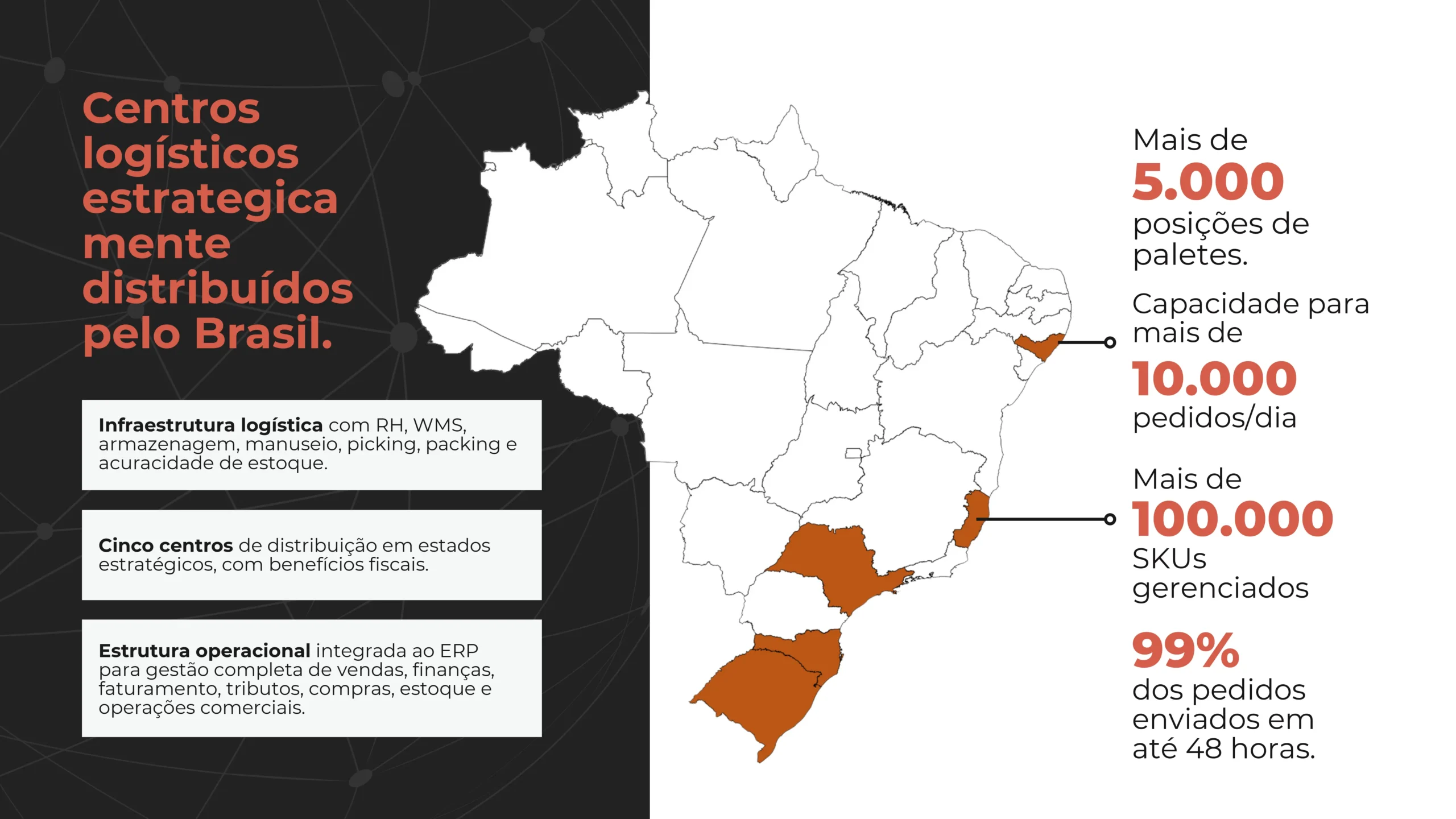 Estoque no Brasil e cross-docking da China garantem entrega rápida e operação flexível.